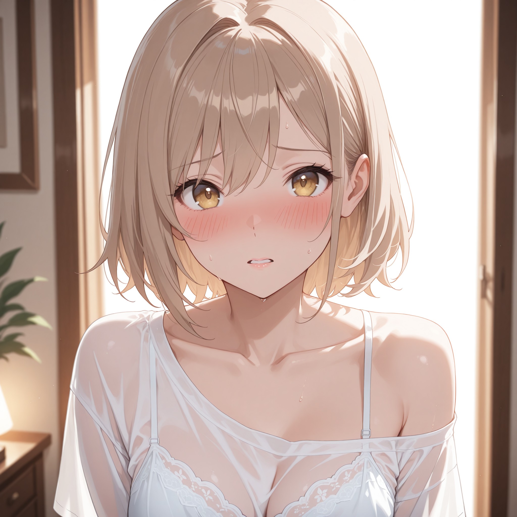 masterpiece, best quality, high quality, ultra highres, 8k resolution, absurdres, extremely detailed, sharp focus, 1girl, beautiful, long light brown hair, white see-through shirt, sheer fabric, collarbone, bare shoulders, blush, parted lips, looking at viewer, embarrassed expression, soft indoor lighting, cinematic lighting, depth of field, warm tones, detailed background