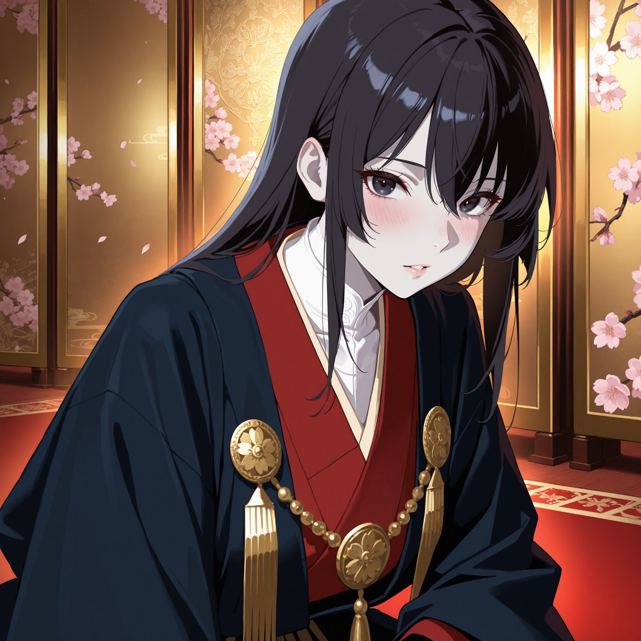 豊かな黒髪はいつもより丁寧に整えられ、長い睫毛が伏せられるたびに緋毛氈の緋色がその頬へと反射した。格式張った衣の重みが、かえって彼女の柔らかさを際立てていた。