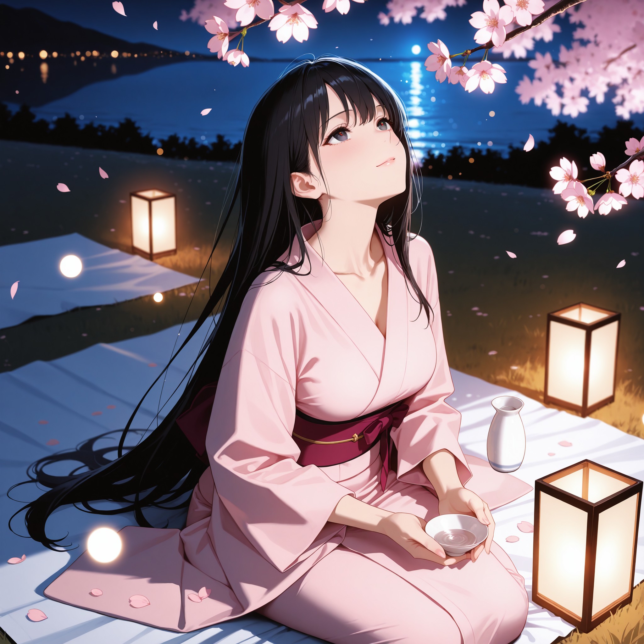 誰に話しかけるでもなく、ただ桜と夜と、透き通った酒だけが友だった。淡いピンクの着物の袖を風にそっとさらわせながら、凛は小さく微笑んだ。