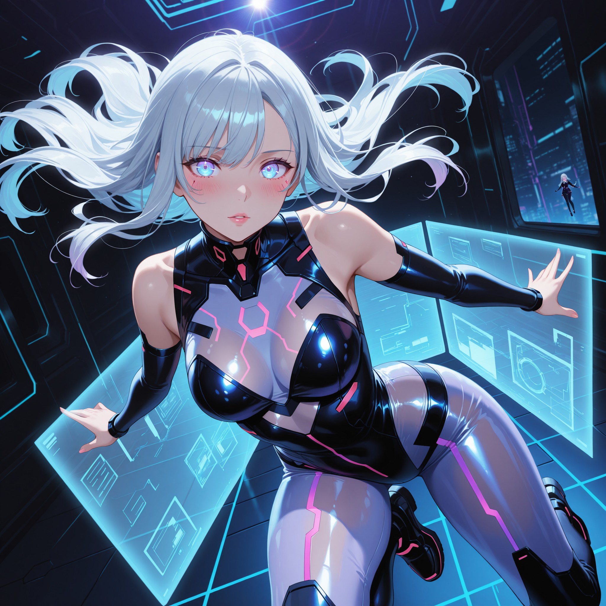 銀色の髪が無重力に広がり、シアンの瞳が静かに開かれる。彼女の名はリーシェ。この電脳世界における、もうひとりの自分。