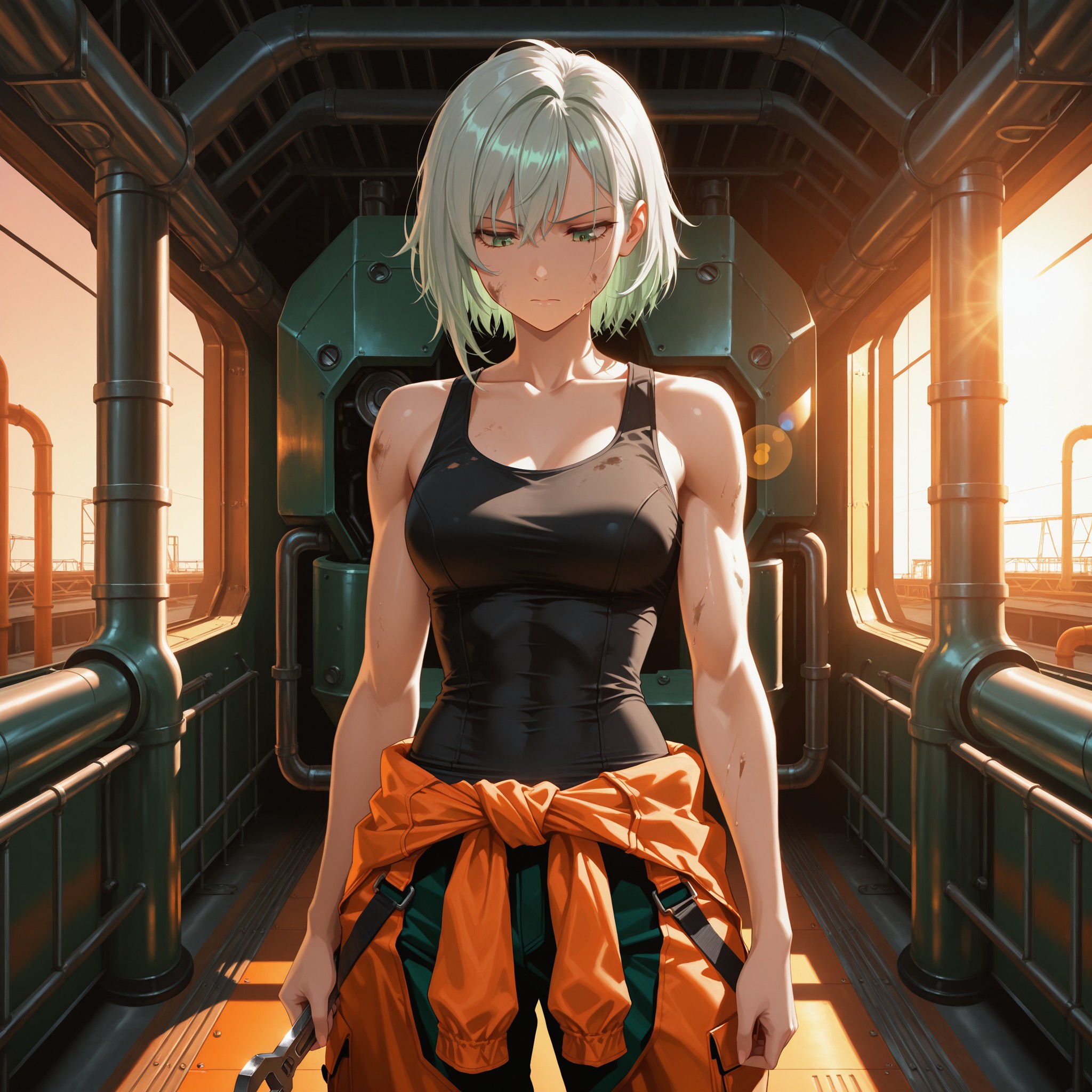 オレンジのフライトスーツを腰まで脱ぎ下ろし、黒のタンクトップひとつで巨大な脚部パーツに向き合っている。大型レンチを握る細い指に力がこもるたび、二の腕の筋がしなやかに浮き上がった。