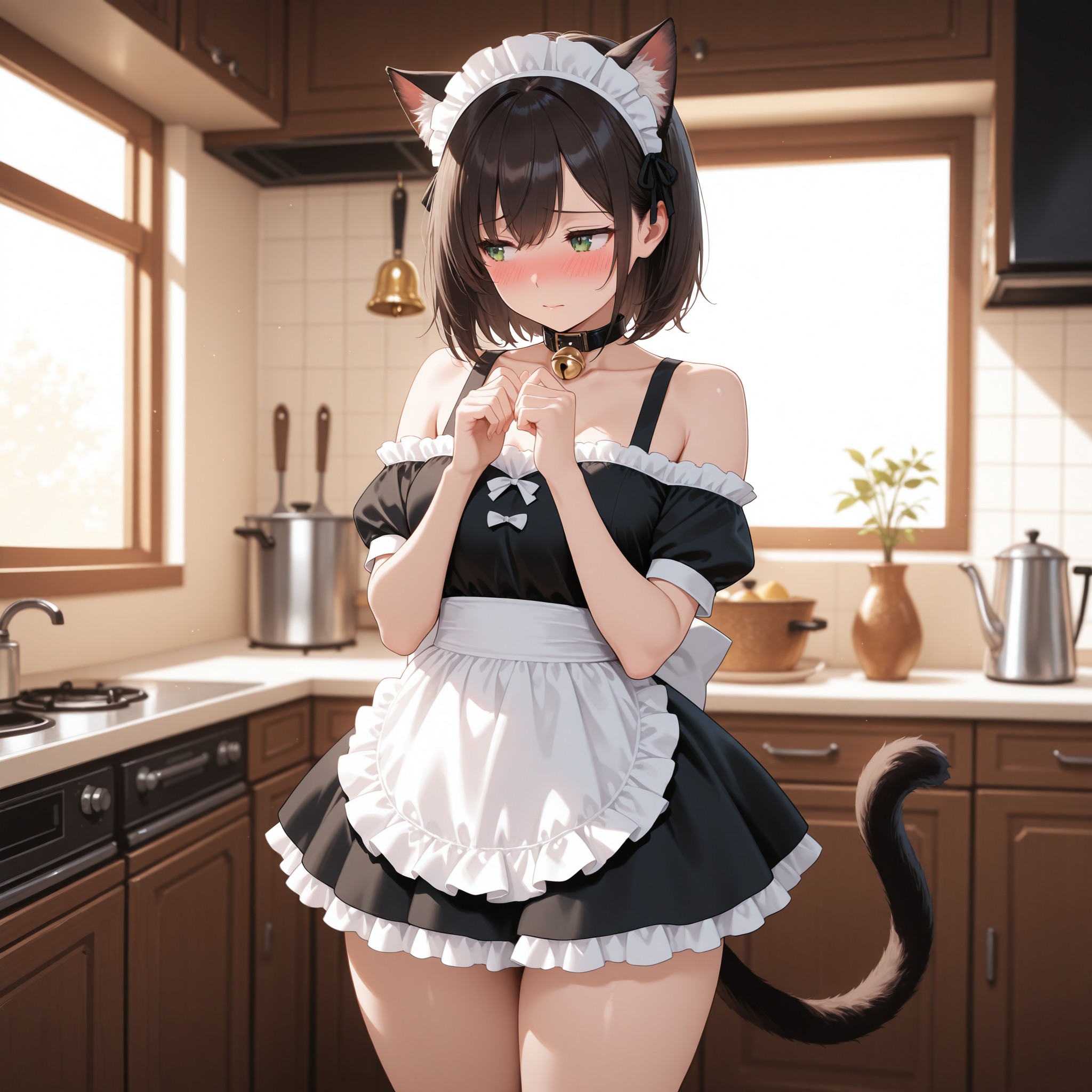 masterpiece, best quality, ultra highres, absurdres, extremely detailed, sharp focus, 1girl, solo, cat ears, fluffy cat tail, bell, bell collar, maid, maid headdress, frilled apron, black dress, white apron, off-shoulder, bare shoulders, collarbone, blush, shy, looking away, fidgeting, standing, thighs, indoor, kitchen, warm lighting, cinematic lighting, depth of field