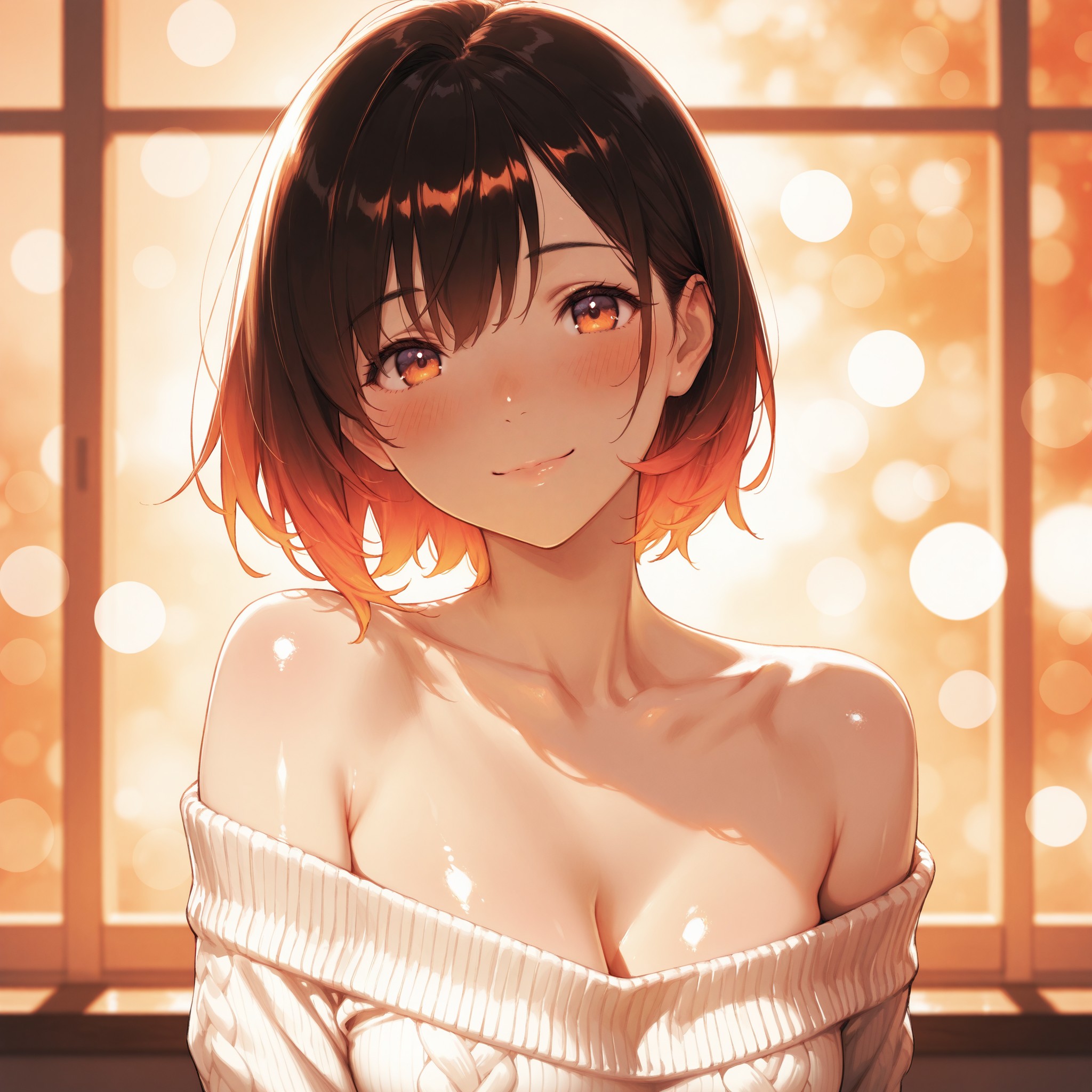 masterpiece, best quality, ultra detailed, 1girl, beautiful face, glossy skin, smooth skin, skin glow, soft lighting, indoor, off-shoulder knit sweater, collarbone, bare shoulders, gentle smile, blush, looking at viewer, upper body, warm color palette, bokeh background, detailed skin texture, porcelain skin