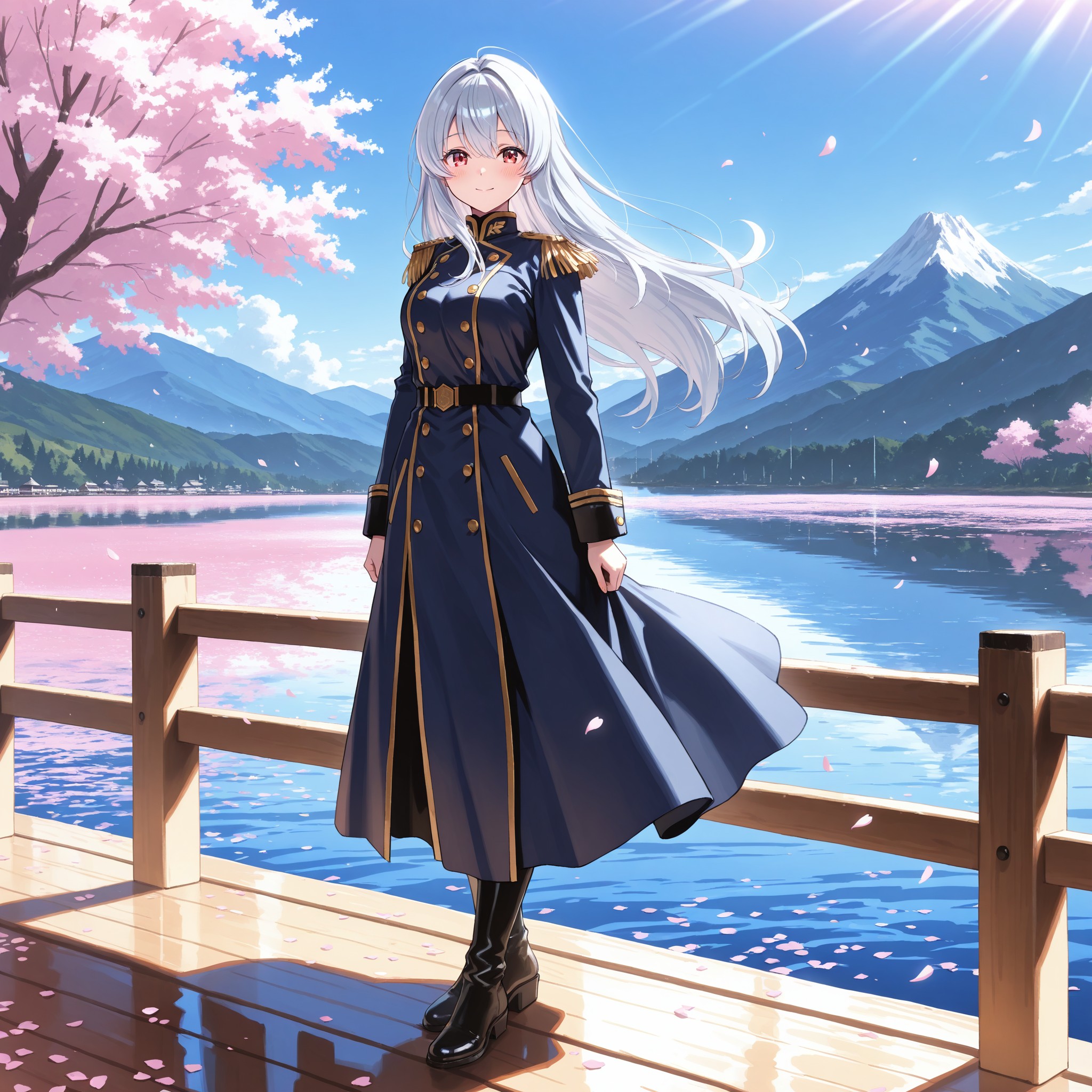 紺色の提督コートが、春風を受けてゆるやかにはためく。金のエポレットが陽光を弾き、腰まで流れる銀髪がきらきらと輝いた。湖面の照り返しが全身をリムライトのように縁取り、その姿はまるで本物の海軍提督のようだった。