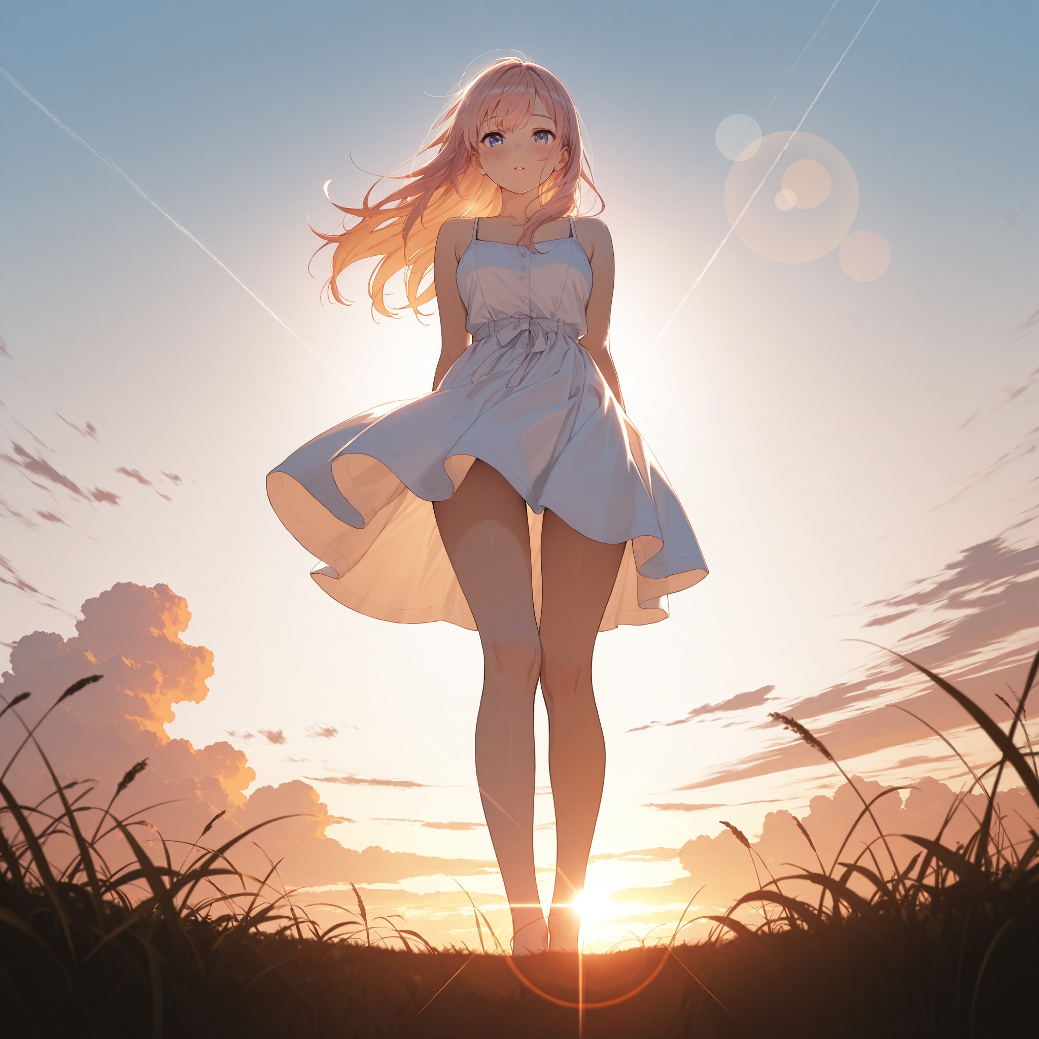 masterpiece, best quality, ultra detailed, 1girl, beautiful detailed eyes, long hair, standing, backlit, backlighting, silhouette, full body, slim waist, thigh gap, bare shoulders, white sundress, wind lift, looking at viewer, blush, parted lips, golden hour, lens flare, dramatic lighting, from below, cinematic composition