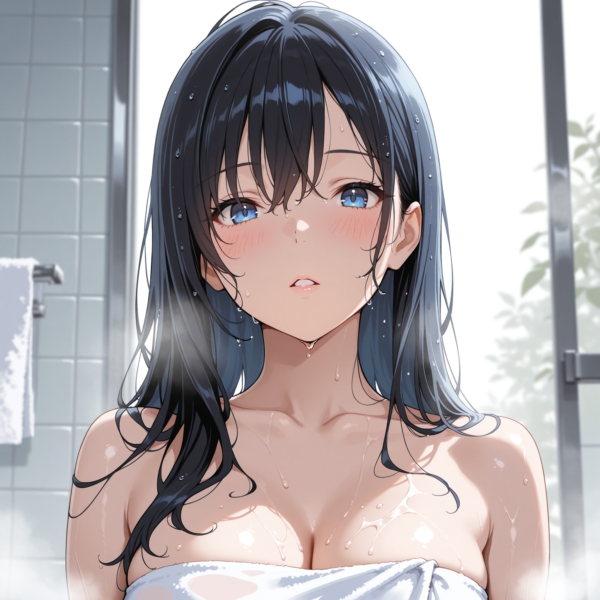 1girl, masterpiece, best quality, high quality, ultra highres, absurdres, extremely detailed, sharp focus, wet hair, after bath, bathroom, steam, white towel, collarbone, bare shoulders, upper body, looking at viewer, blush, parted lips, water droplets on hair, water droplets on skin, soft lighting, depth of field, cinematic lighting, atmospheric